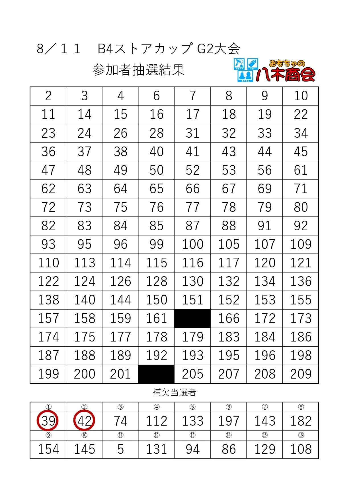 8/11(月祝)B4ストアカップ G2大会 参加者抽選結果及び当日について(8/10更新)